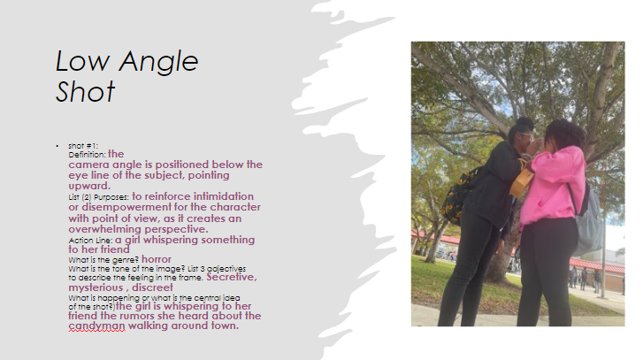 the concept of this assignment was to apply the camera work techniques and create the camera shots for the main concepts of camerawork, shot size, camera angles, camera framing, and camera composition. Students worked in groups of 2-4 to complete this assignment. each group had a week to take pictures either related to their movie genre they choose or to take pictures of miscellaneous things to complete the assignment.